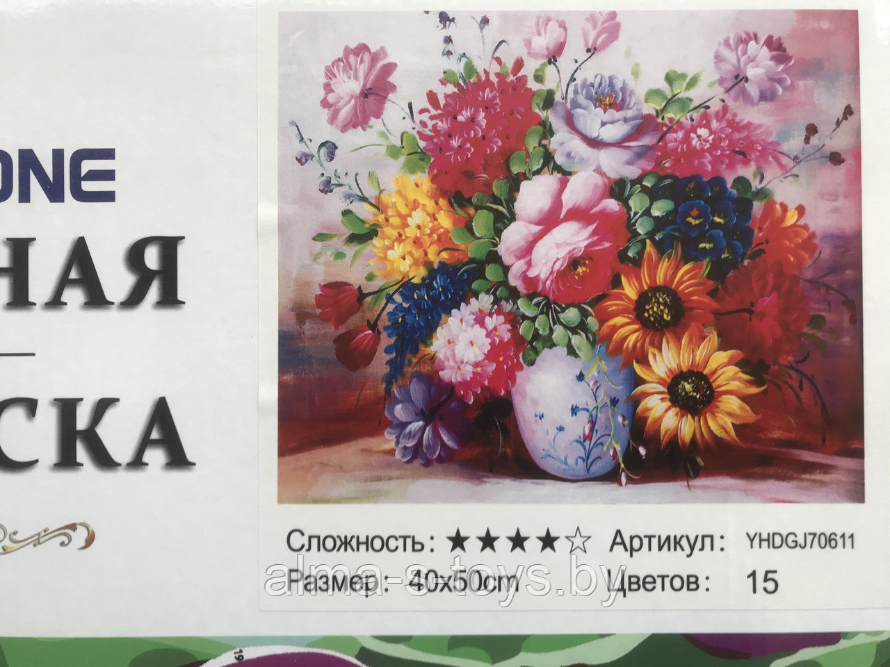 Центр картины выкладывается алмазными стразами ,задний фон рисуется по номерам ,что придаёт картине эффект 9D
